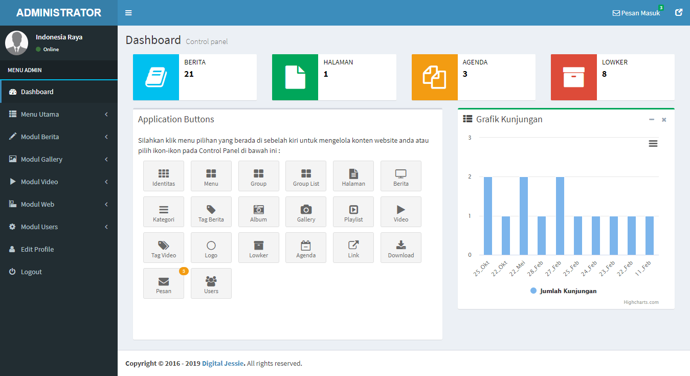 Pagi ini Digital Jessie kembali merilis system informasi website yang di peruntukan untuk sebuah Kampus atau perguruan tinggi dengan judul Download Sistem Informasi Website Kampus. Namun, tidak menutup kemungkinan Aplikasi ini juga bisa digunakan untuk atau sebagai CMS Sekolah. Untuk framework aplikasi saat ini dibangun dengan menggunakan Code Igniter sehingga tingkat keamanan lebih terjamin.